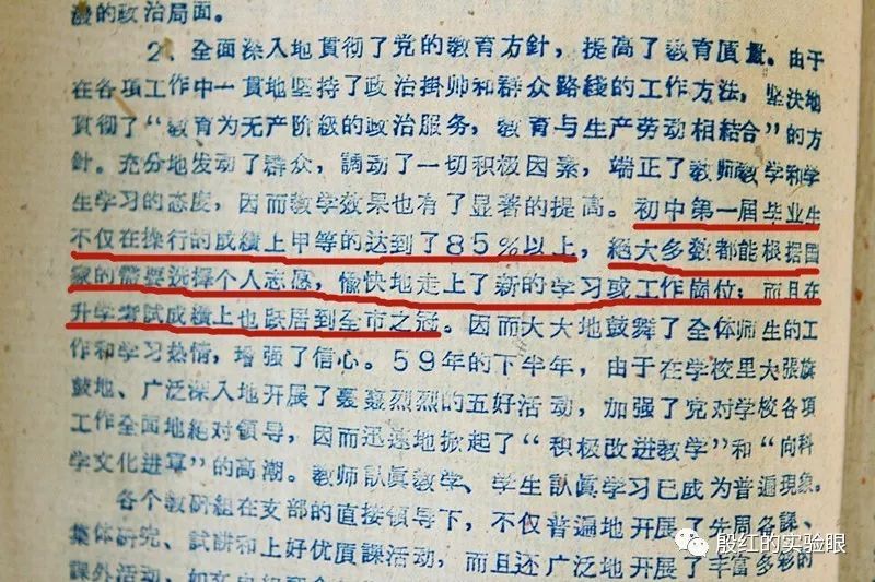 1960年2月,《中共郑州师范学院附属中学支部委员会关于1959年教育工作总结》中的截图,显示初中第一届学生升学成绩跃居全市之冠。照片由殷红于2014年1月28日拍摄。
